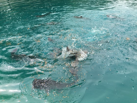 The ten pound catfish in the pond ate and played.