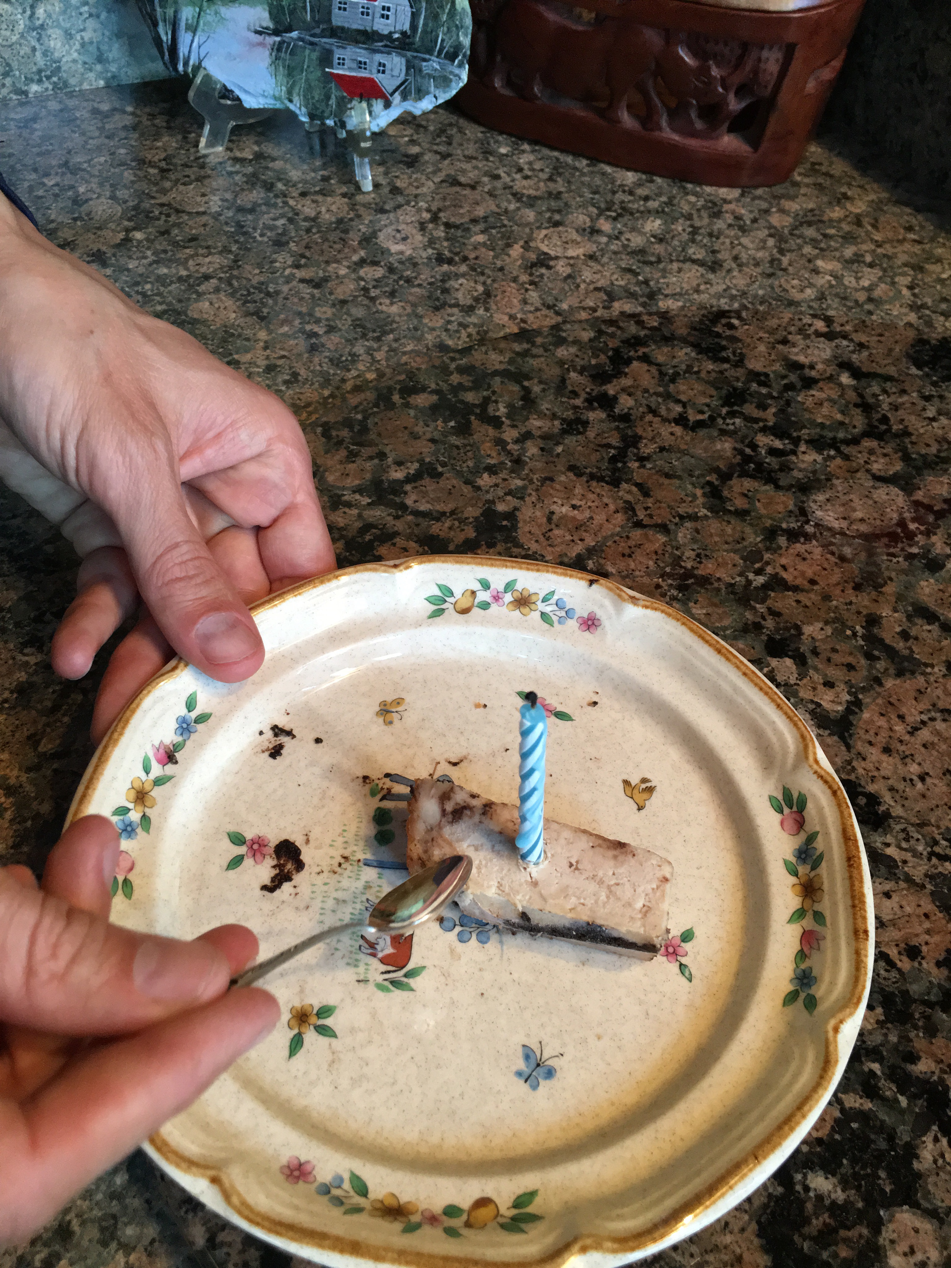I allowed a minute amount of chocolate to impose upon my pre-marathon 2 week caffeine fast. “Thanks so much, Debbie, for my vegan chocolate birthday cheesecake!” (Mom scraped off a bunch of the chocolate for me.)
