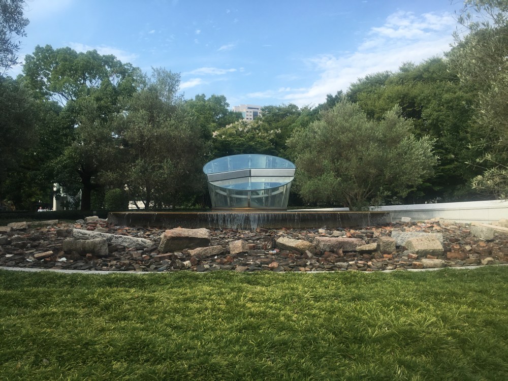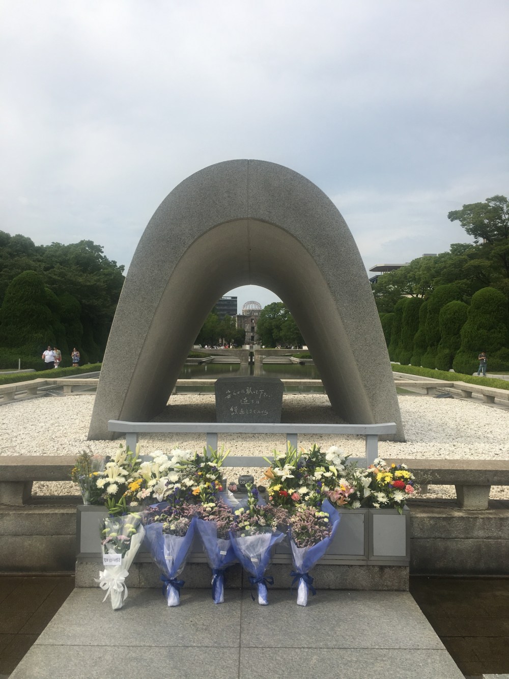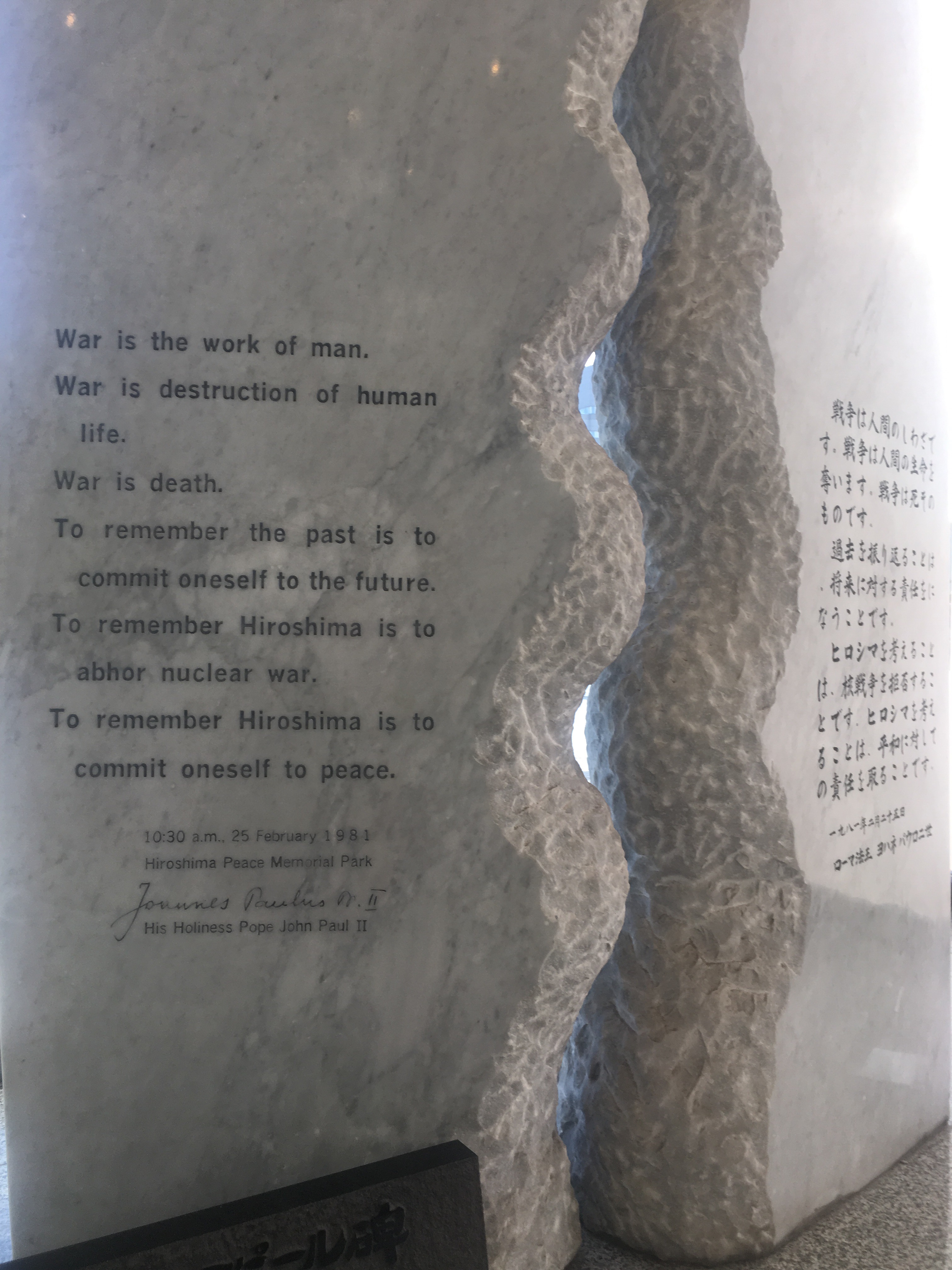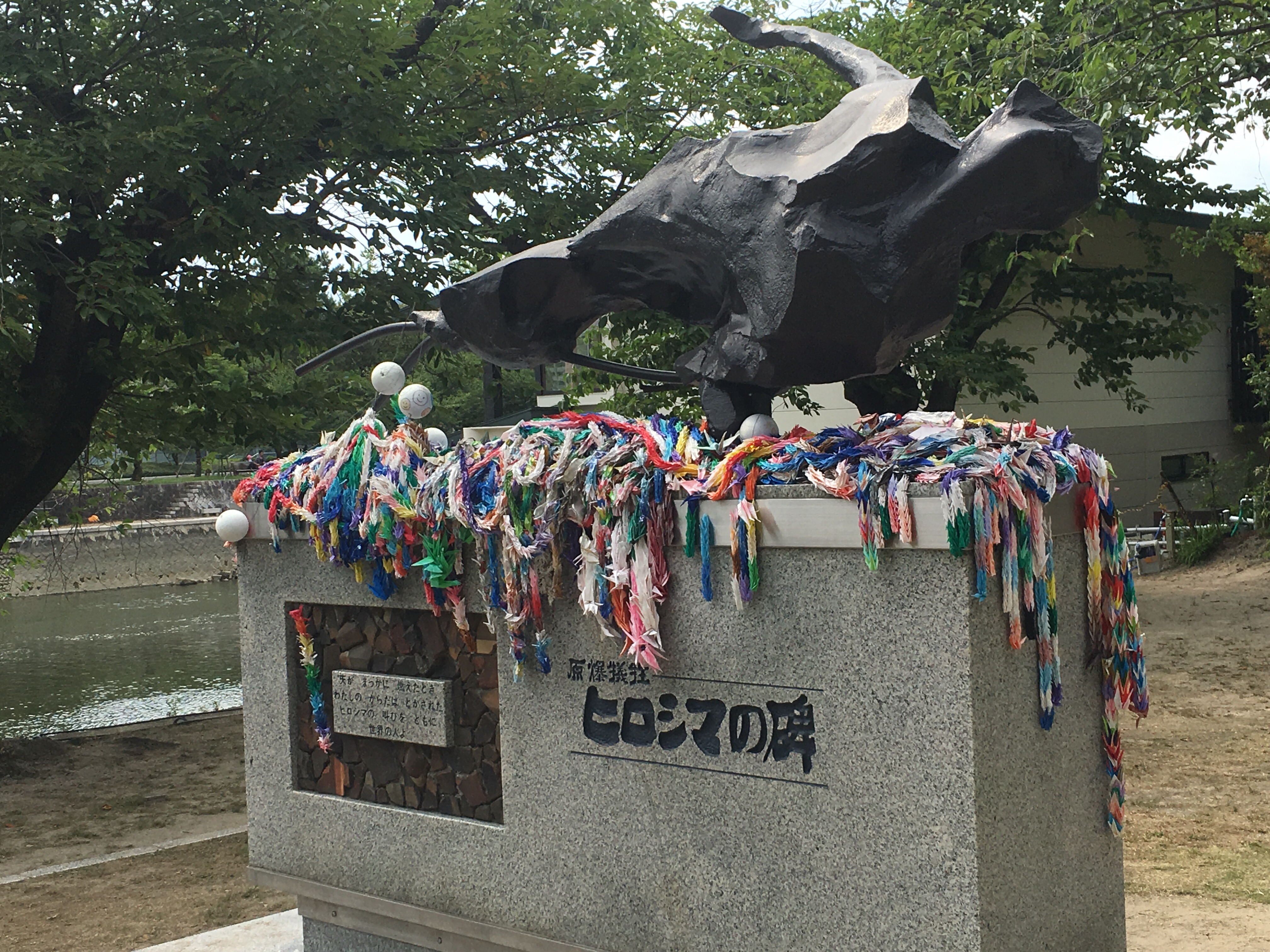 For all the children forced to fightThis bridge was the official target of the bomb yet survived, convulsing severely. Rebuilt in 1983 due to old age.For the more than 10,000 children killedSadako Sasaki’s shoes. She was two when the blast hit near her home. For ten years she was healthy, even competing on her school’s relay team. Then at twelve she was diagnosed with leukemia. She battled fiercely, hoping to survive by making a thousand paper cranes. She eventually succumbed. For the thousands of people buried at this siteFor the 10% or more of victims of Korean descentThis clock chimes every morning at 8:15.
