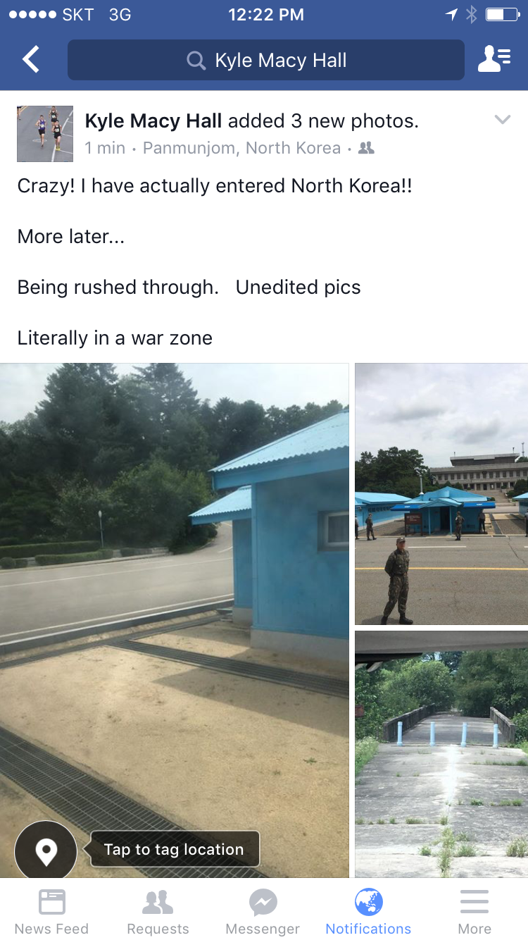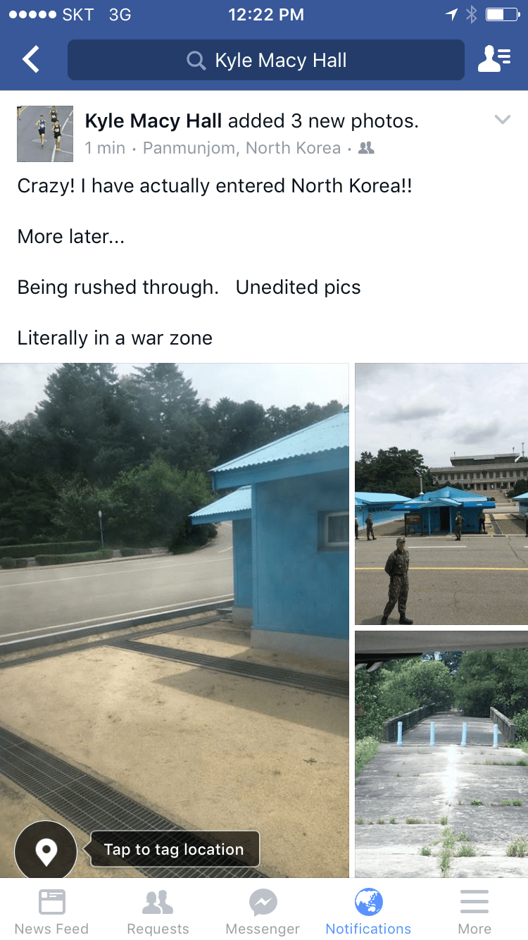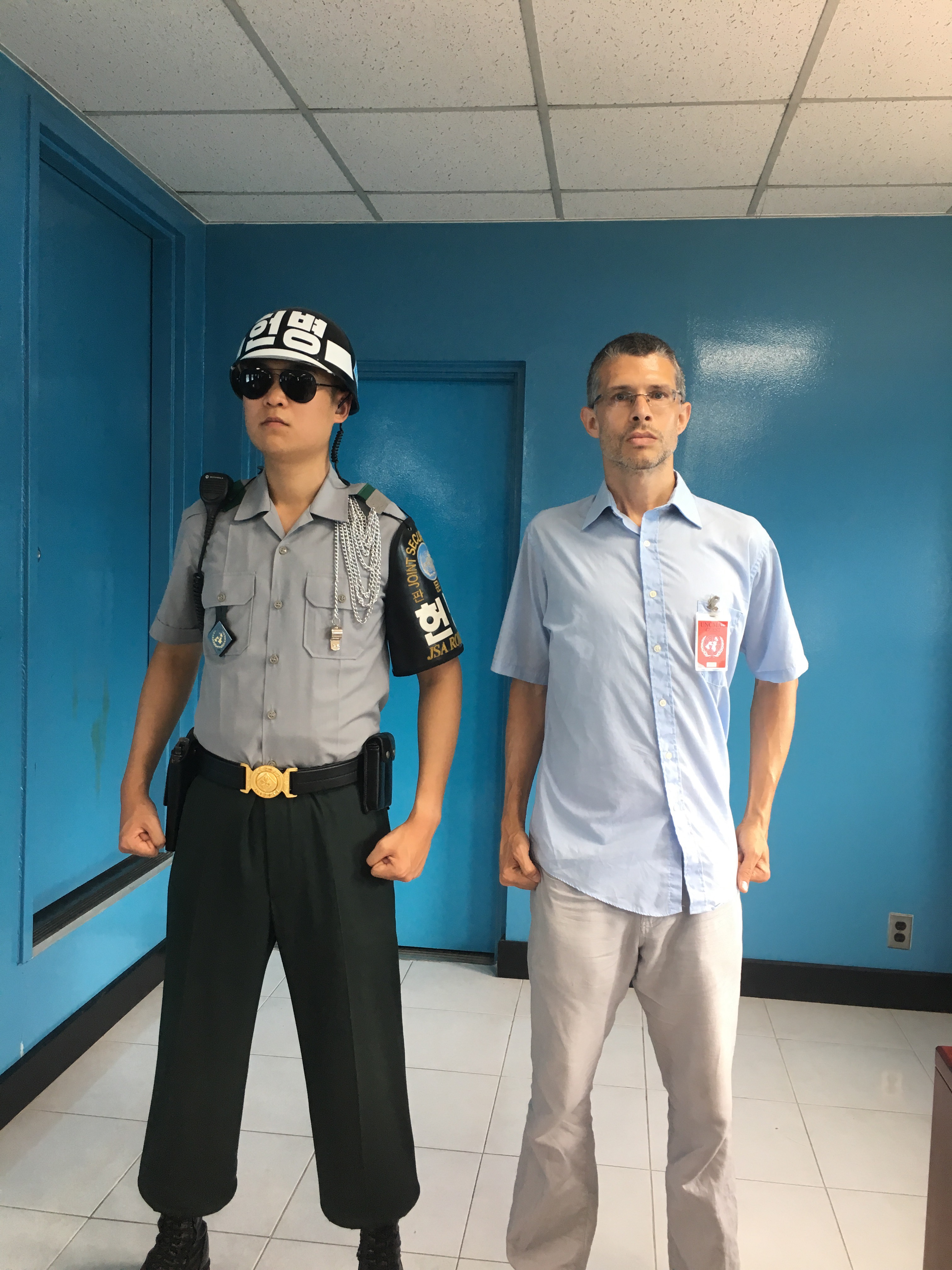In North Korea with a Republic of Korea (South Korea) soldier. I am awkwardly trying to imitate the intimidating and completely motionless stance all ROK soldiers keep when facing off with North Korean soldiers. How is he in North Korea with me? No South Korean citizen is even allowed to get anywhere near as far as I’ve come, but we are in a militarily neutral zone carefully monitored by the United Nations.