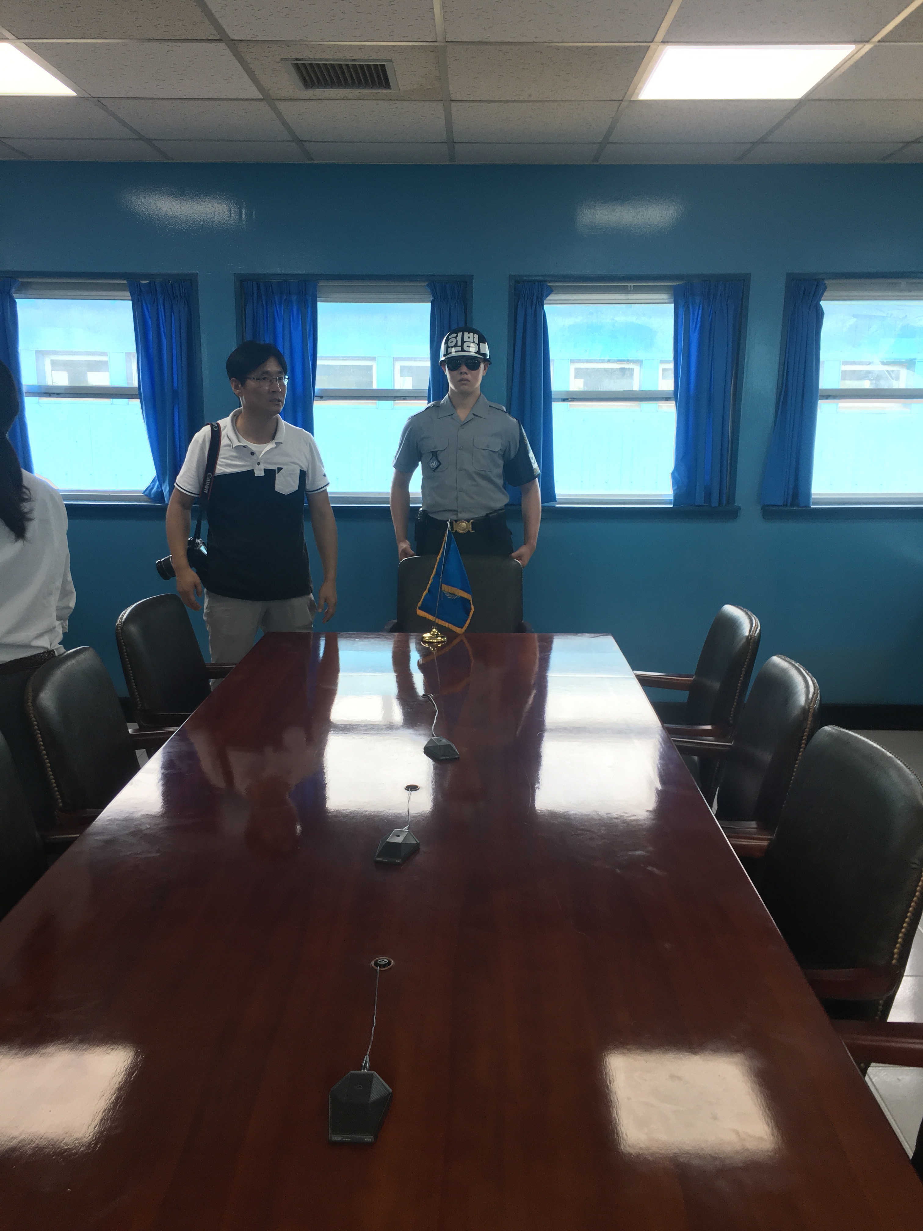Unbelievable. My left foot is is South Korea, my right in North Korea. This table is where representatives of both sides meet periodically, along with representatives of neutral nations such as Sweden, Switzerland and Poland.