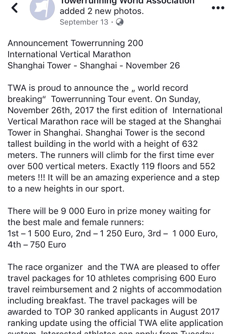 The highest vertical building run ever: 552 vertical meters up Earth’s second tallest building–Shanghai Tower.