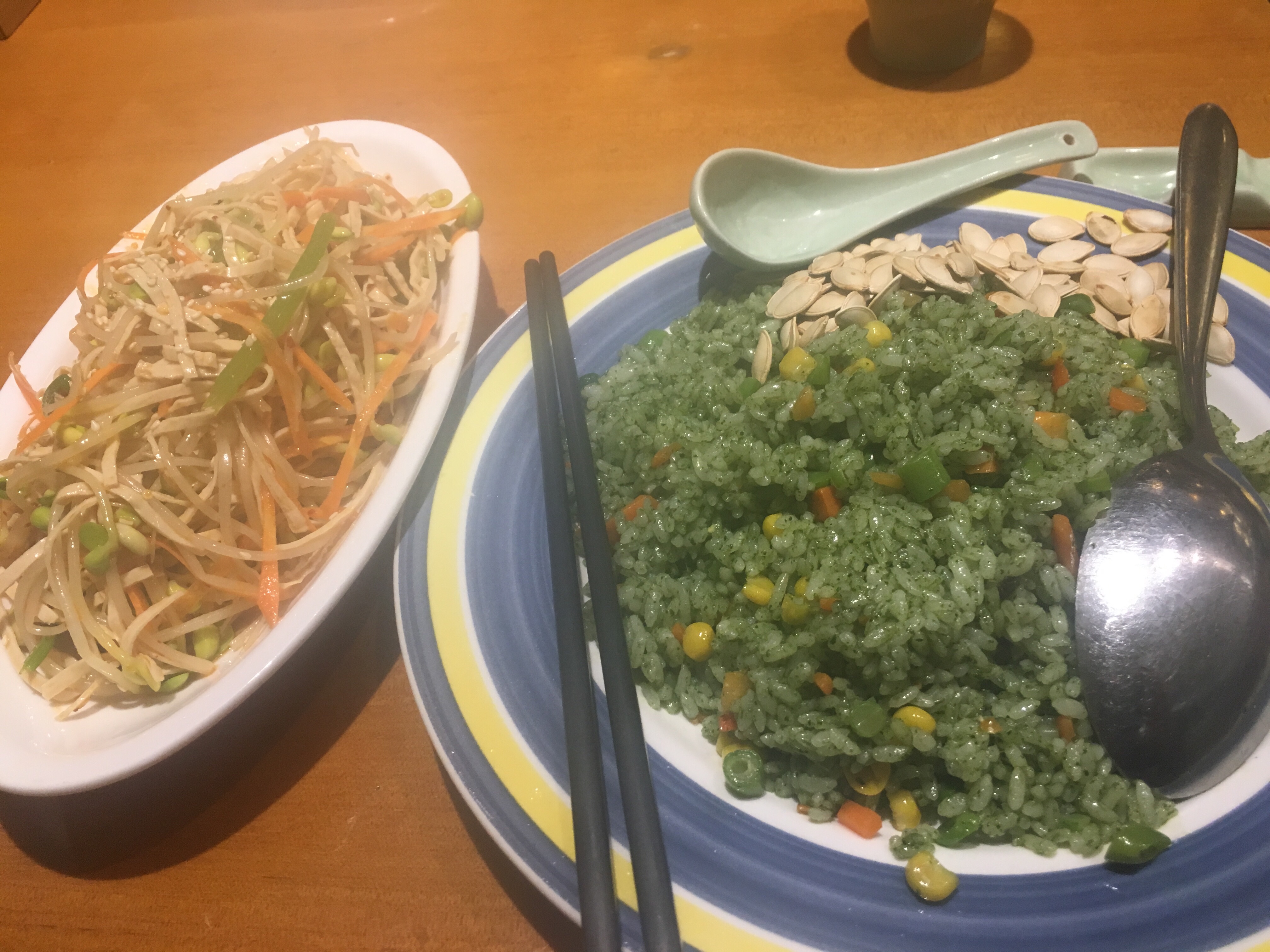 My vegan pre-race dinner had me fueled up: tofu-vegetable salad & the best fried rice ever, with pumpkin seeds on the side.
