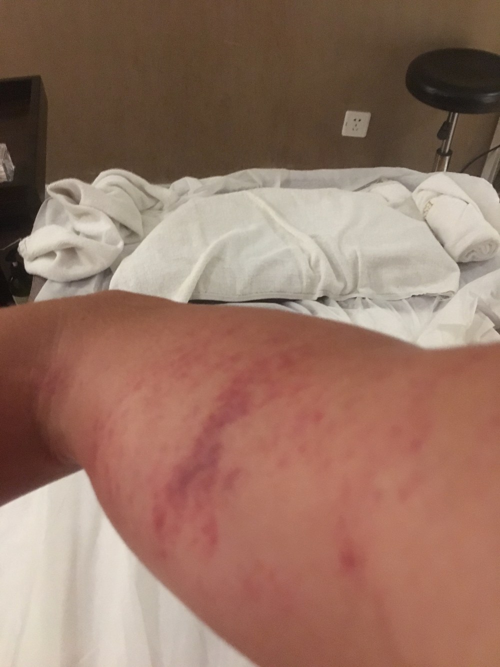 She began using a studded board to roll over my calves. It’s never pleasant having calves massaged. And the hammy still needed a strong once over. But, soon, the board was up on my arms.