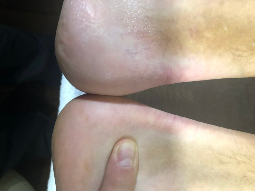 3 inches probably an exaggerated number, but clearly imbalanced. And note new bout of swelling in left heel due to “trauma” of walking again–and running too soon.