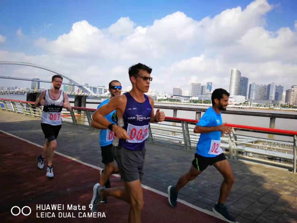 Always fascinated by Chinese clothing choices. Gorgeous day, albeit very warm, on the East Bund. Journey to the East half marathon and 10k. Got up to 81 degrees today, around 78-80 during the race; more of a marathon pacing workout. However, if I'd been able to hang with Vincent & Pedro on the second loop of the course, I would have. We all worked together in first loop--4:05 pace for 10.6 km-- but in second loop, I stayed ahead of my projected marathon pace (4:08), while they dipped down into 3:50's. I averaged 4:07 for second loop.Strong run overall. Great workout. Guilin surprised me on bike as I ran back to InterSport. She came loaded with Pocari Sweat sports drinks and a tub of pomelo and pear fruits. I changed my shoes at store and ate fruit and refueled. My girl then accompanied me as I completed another 10.2km.